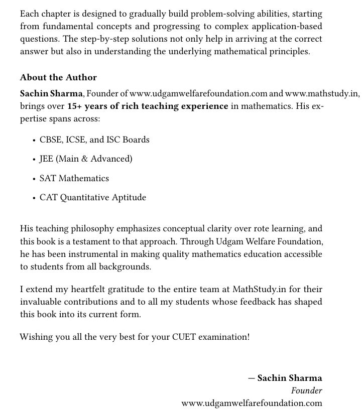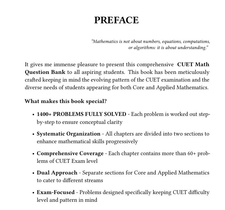 The Common University Entrance Test (CUET) is your gateway to central universities. Mathematics can be a high-scoring section with the right practice. Introducing the CUET Maths Question Bank PDF with answers by Sachin Sharma – 1400+ fully solved problems, designed to mirror the real exam pattern and build step-by-step mastery.